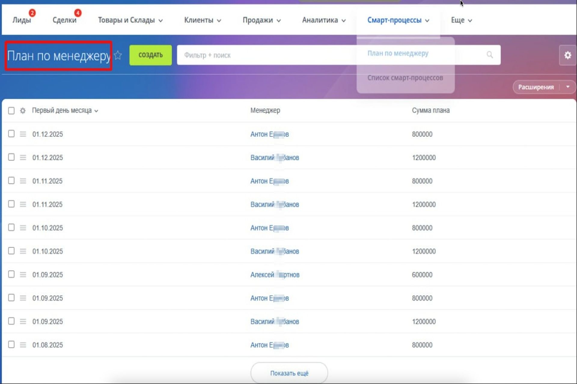 Часть данных для корректного отображения - подготовлена с помощью стандартных средств автоматизации Битрикс24 (бизнес-процессы и роботы) а также доп. учет на базе смарт-процесса для фиксации Плана продаж по сотрудникам помесячно.