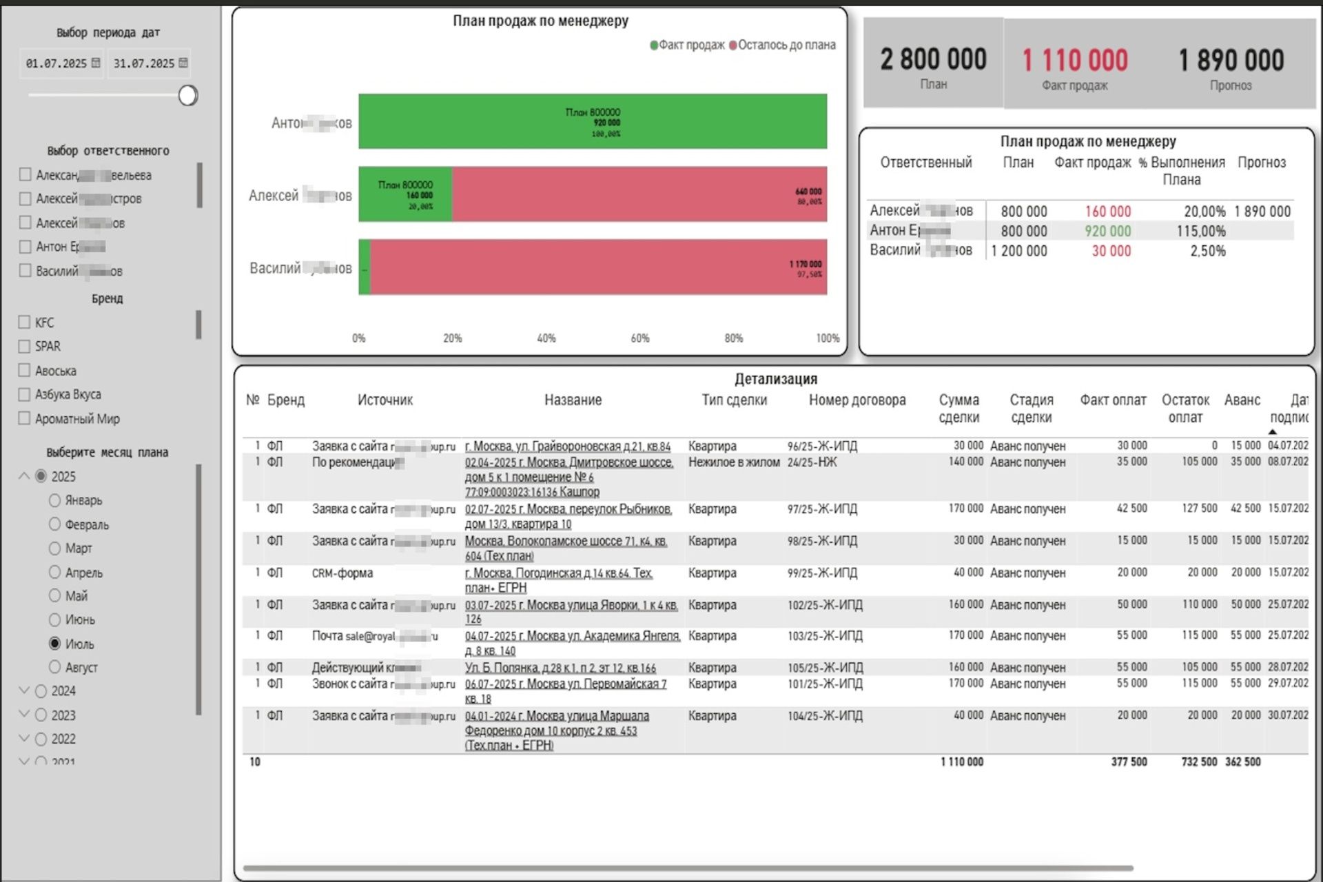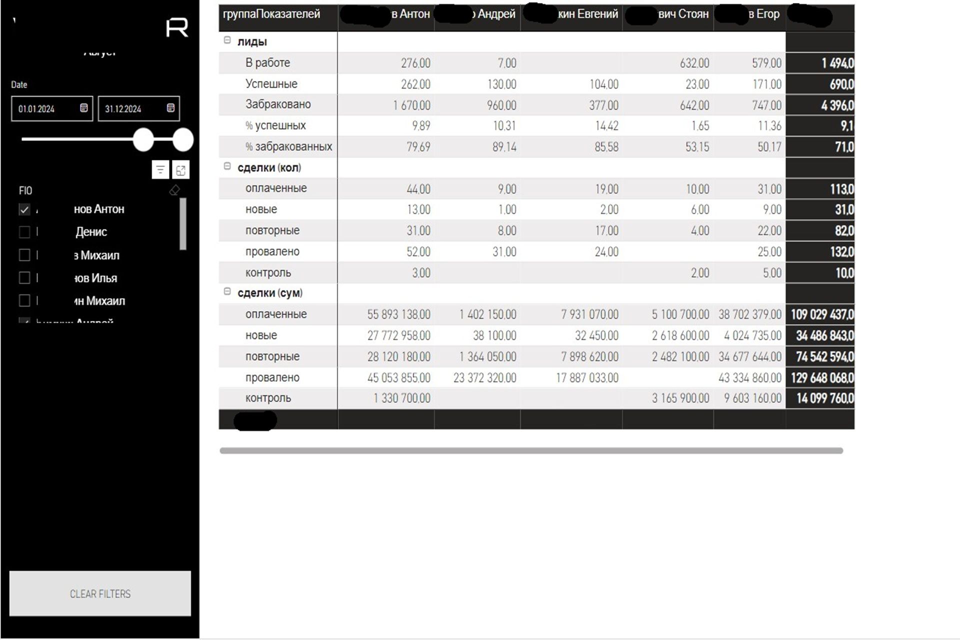 Это комплексный отчет по продажам, который демонстрирует основные показатели работы, не только в разрезе менеджеров, так и показатели лидогенерации и данные в разрезе товаров.