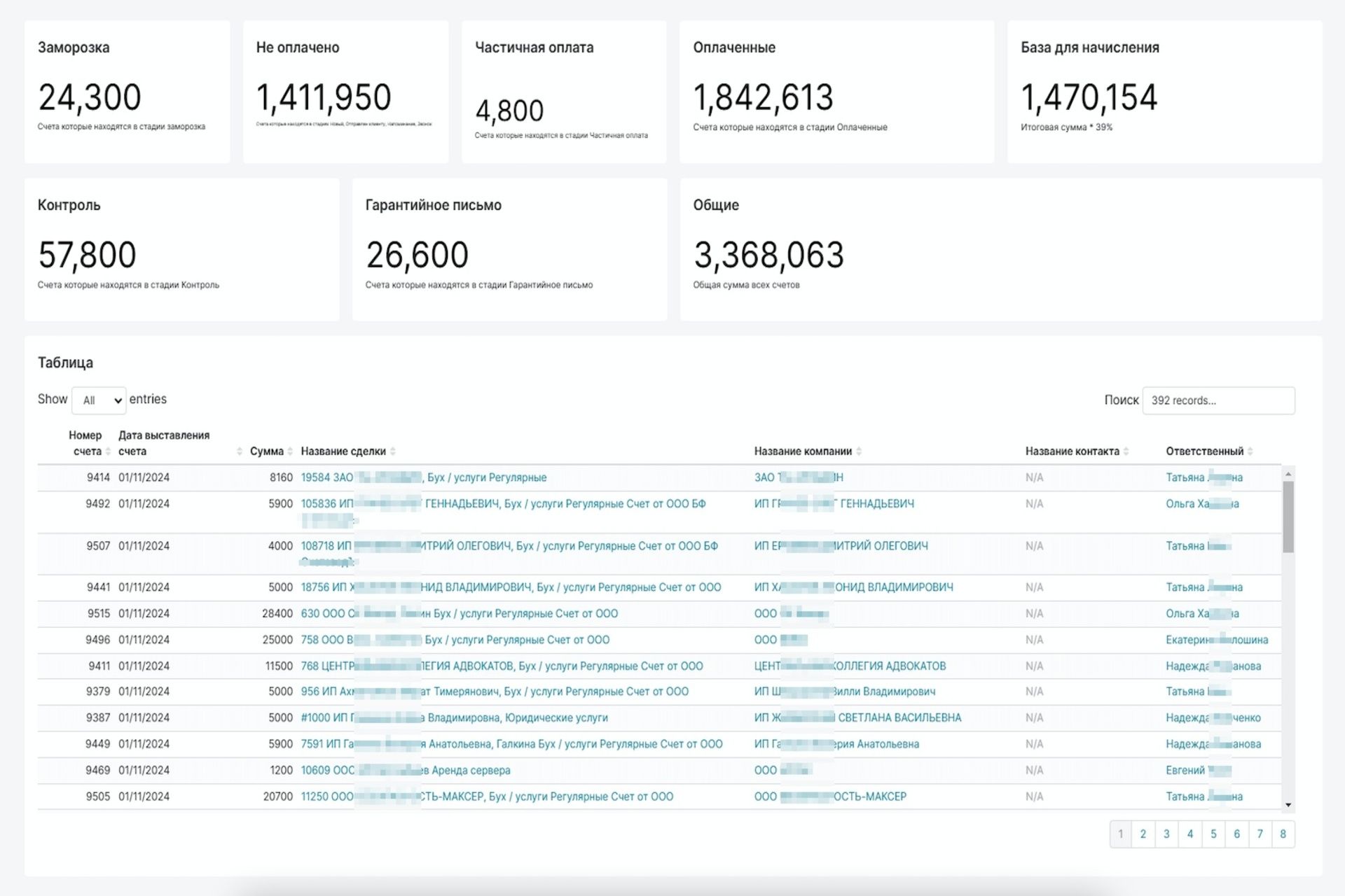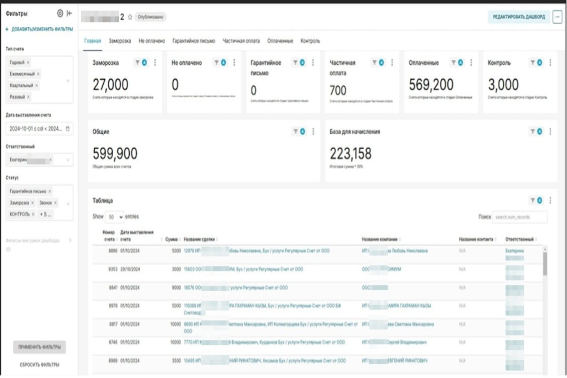 С помощью фильтров можно устанавливать период выборки данных, выбирать конкретного сотрудника, тип счета, дата создания, статус и другие параметры для выборки.