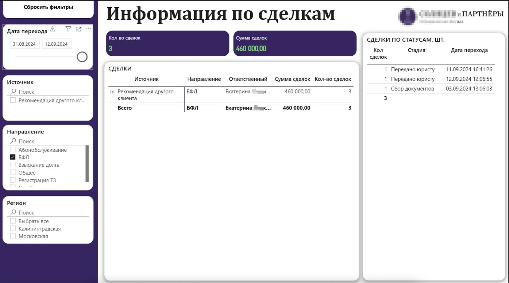 Реализовано 3 отчета на 1 странице: отчет по лидам, сделкам и расчет премии сотрудников