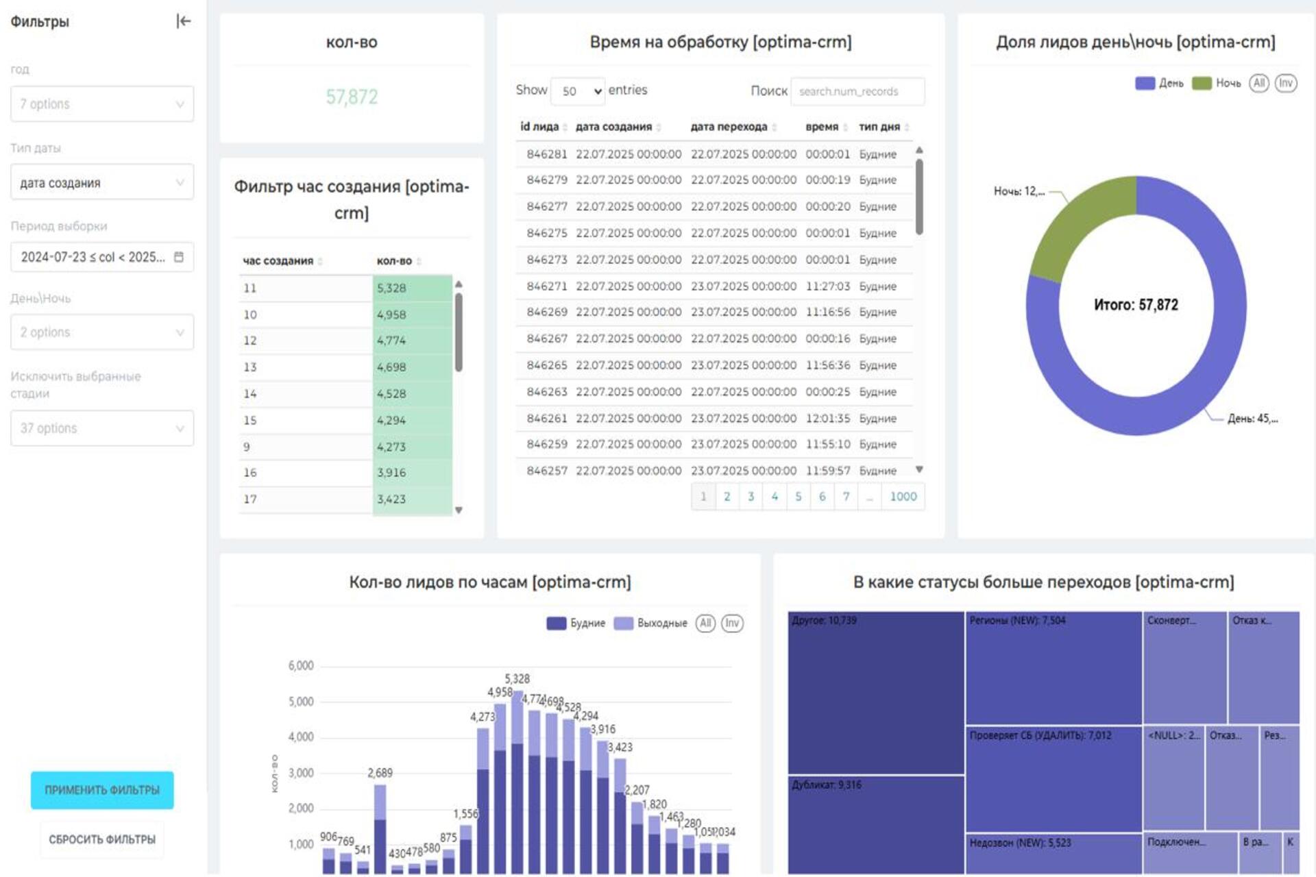 Дашборд показывает в какие статусы было больше переходов, распределение лидов по часам, фиксация время на обработку лида. (найм водителей, воронка для HR)