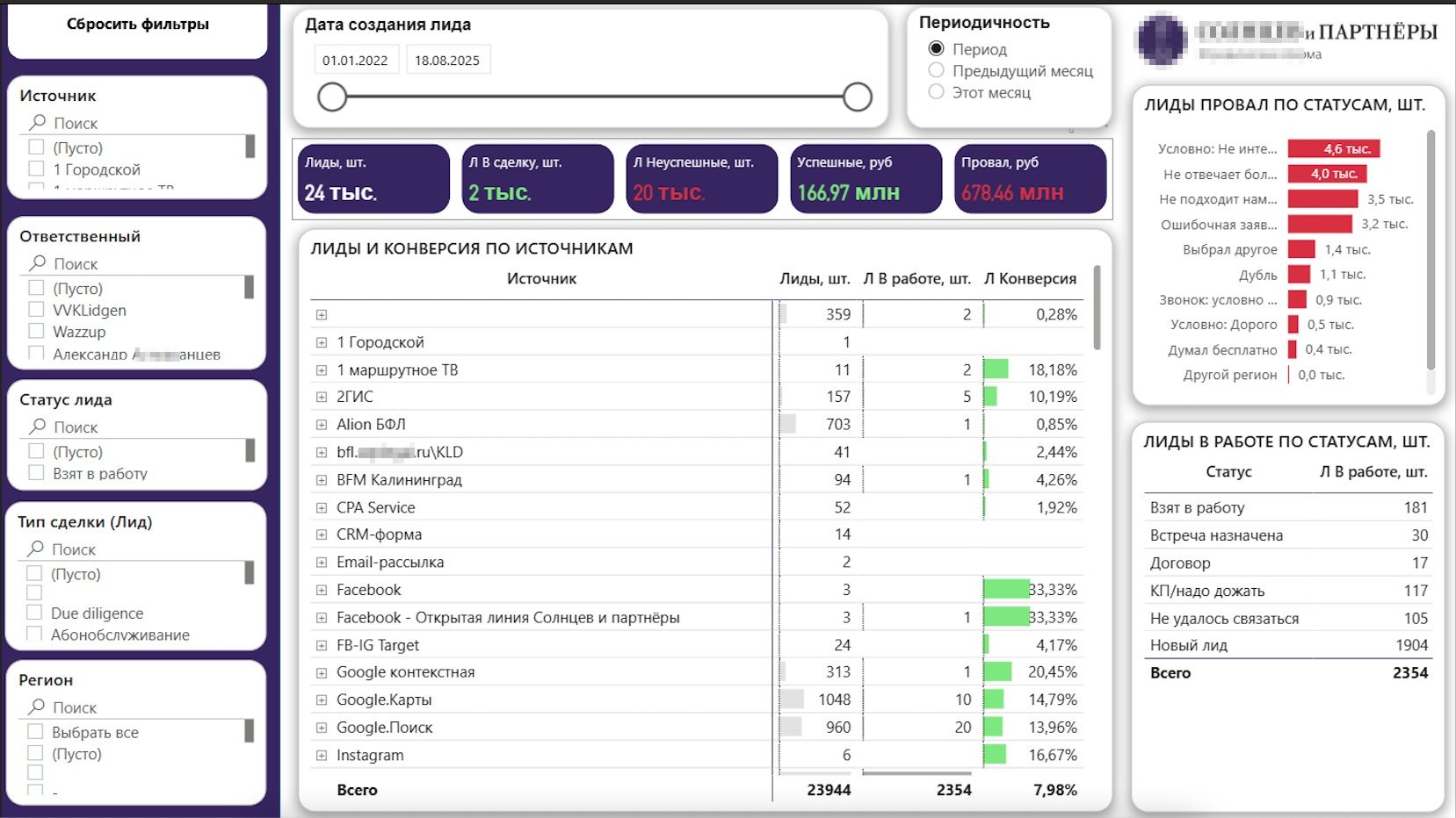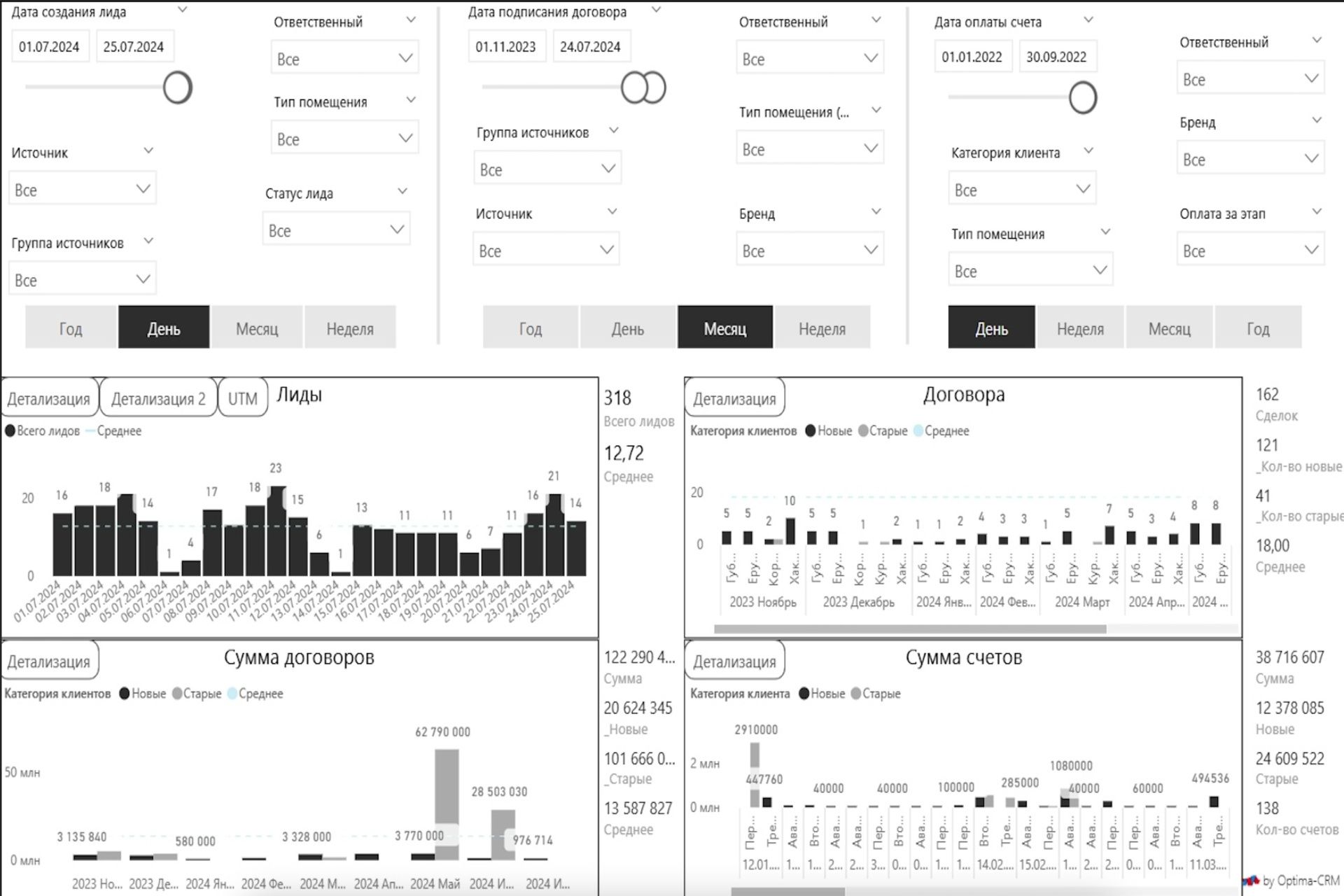 Дашборд для мониторинга работы менеджеров, с лидами сделками, просчет конверсии