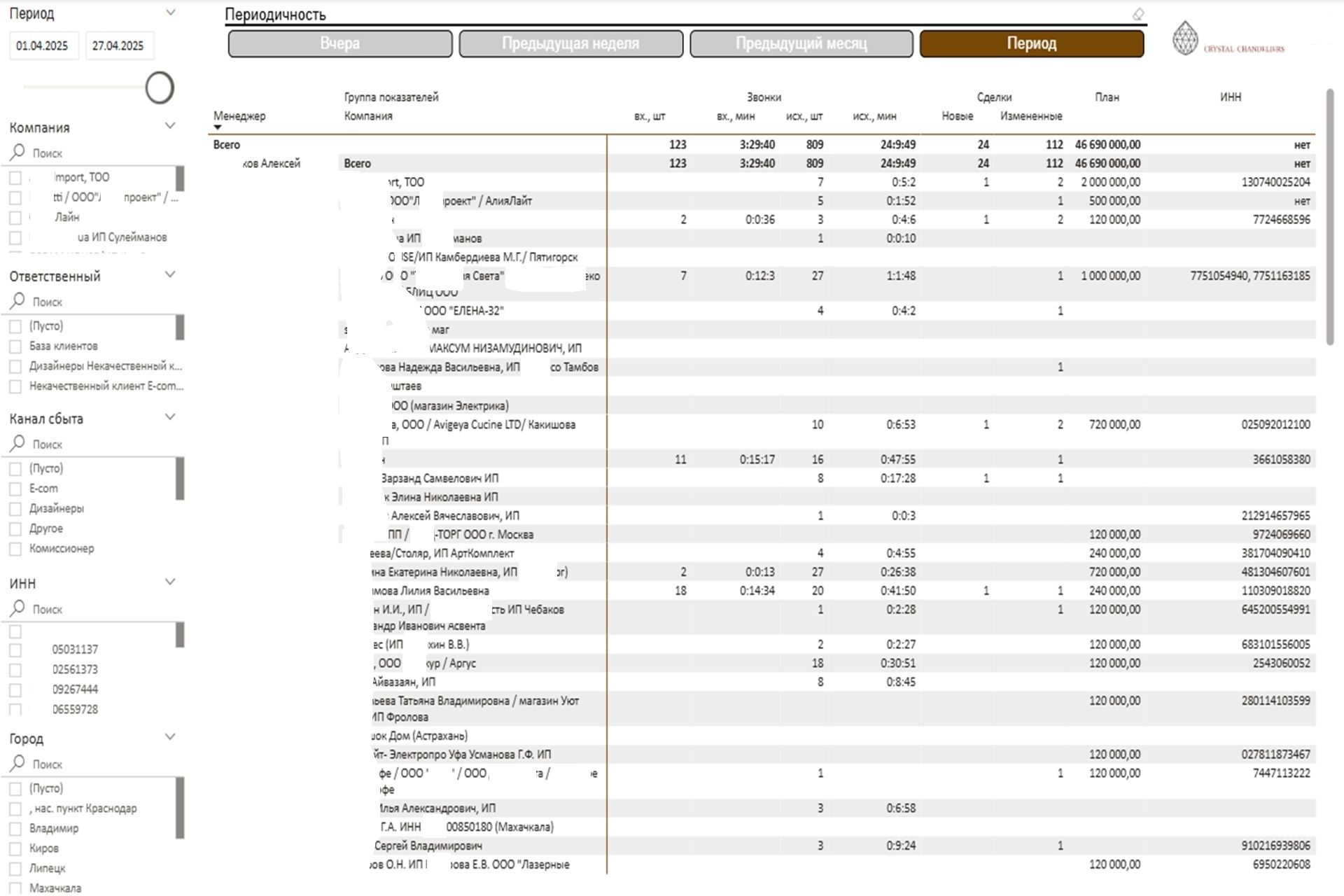 Отчет демонстрирует данные в разрезе по менеджерам и его компаниям, отслеживает работу с клиентами, время проведенное в разговоре, количество сделок, план продаж